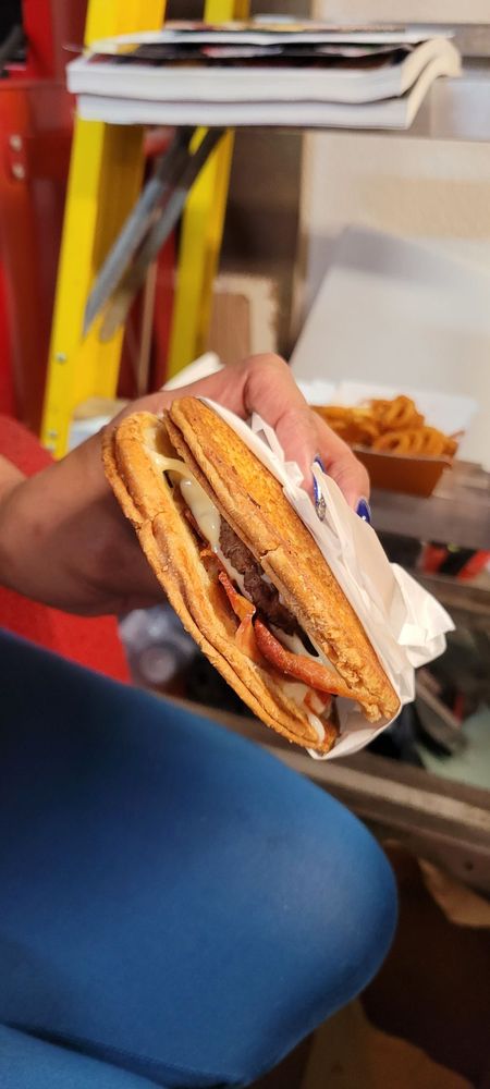 2x 100% beef seasoned as it grills, hickory smoked bacon, melty American & Swiss style cheese, ketchup, mustard & mayo on a buttery bun plus fries & drink.